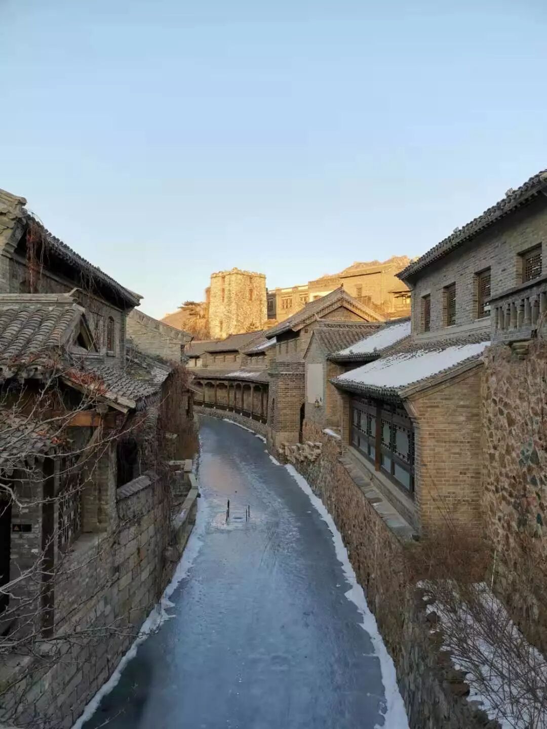Участок Великой китайской стены Симатай , был построен во времена династии Мин (1368-1644 гг.) с целью защиты от врагов. Сверху открывается вид на необыкновенные горные пейзажи, реку и деревню. Этот отрезок стены был отреставрирован в конце прошлого века (1987). А на месте зданий, которые мы увидели, стояли совсем другие (не уточняется, в какое время). Говорят, что раньше здесь действительно была деревня, однако дома в ней выглядели иначе.